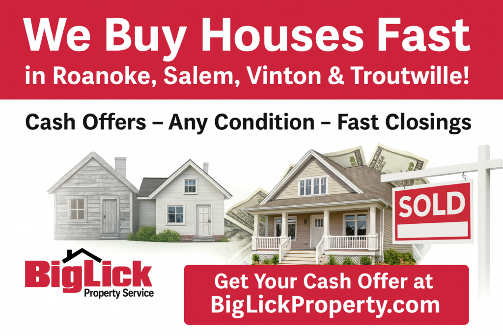 If you’ve been searching online for “sell my house fast Roanoke VA” or “cash home buyers Roanoke VA,” you’ve found the right place. At BigLickProperty.com, we specialize in helping homeowners across Roanoke, Salem, Vinton, Troutville, and beyond sell their houses quickly for cash. We buy houses in all conditions, all situations, and we can make you a fair cash offer in as little as 24 hours.